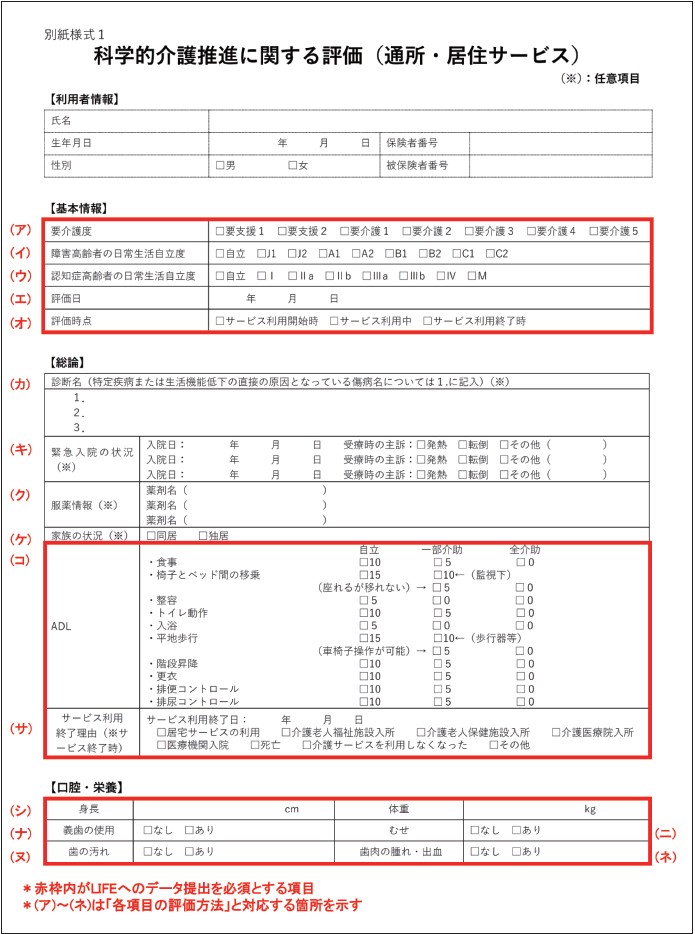 以下の加算様式(イメージ)の赤枠がLIFEへのデータ提出を必須とする項目です。